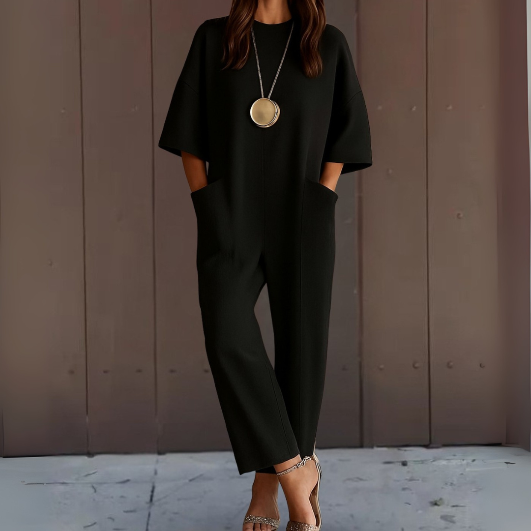 洗練されたシンプルさと気負わない心地よさを兼ね備えた、エレガントなミッドスリーブのジャンプスーツ。上品でありながら自然体で楽しめる一枚です。