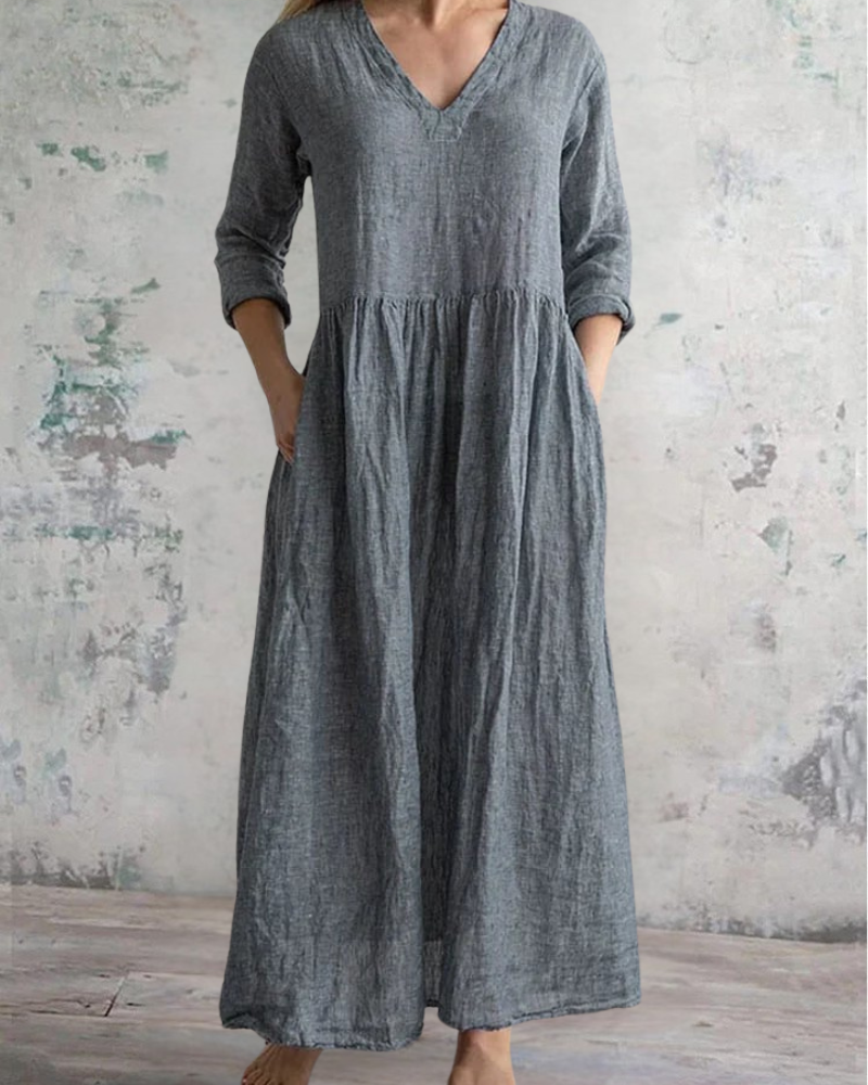 春の訪れとともに、このワンピースは最適な選択肢です。通気性の良い軽やかな生地は暖かい日中でも快適に過ごせ、7分袖が朝晩の涼しさにも対応します。