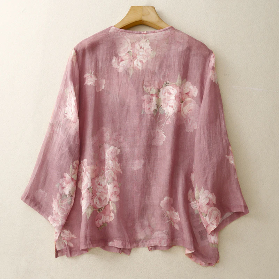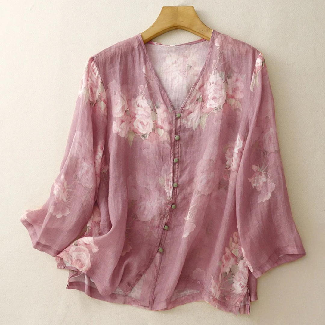 フラワー柄Vネックリネンブラウスのやさしい着心地と上品な魅力を、ぜひ日常の装いに取り入れてみてください。