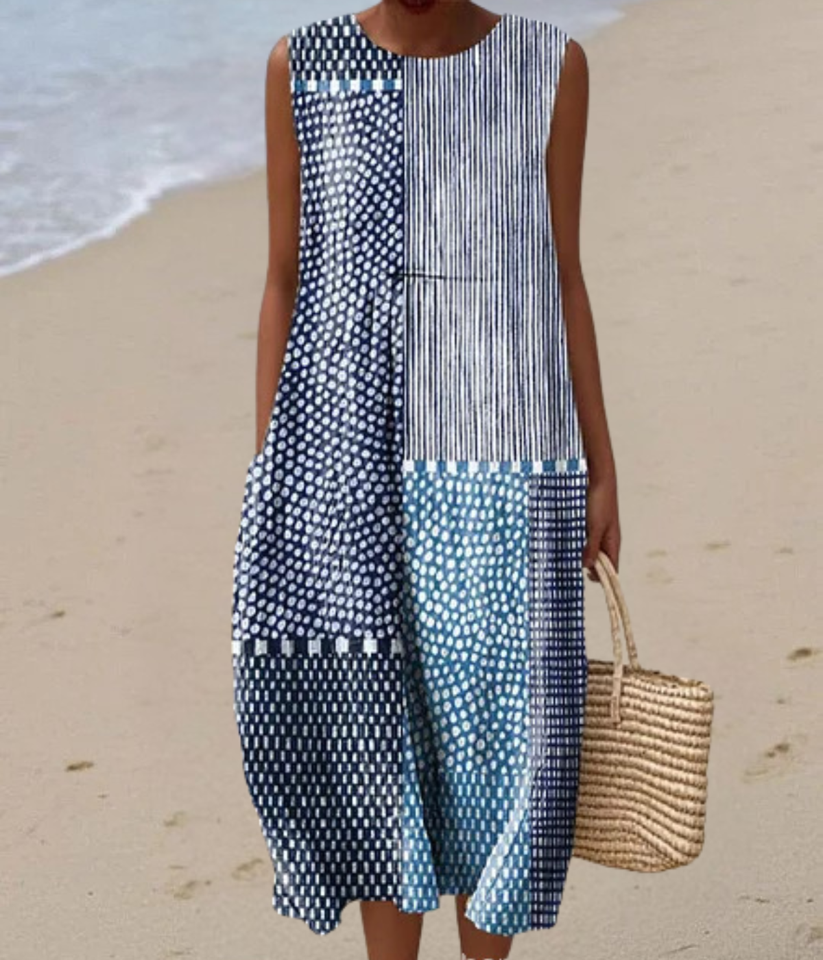 上部のドット柄と下部のカラーブロックが絶妙に調和し、控えめながらも印象的な装いに。ナチュラルなカゴバッグやサンダルと合わせれば、肩の力を抜いた大人のリラックススタイルが完成します。