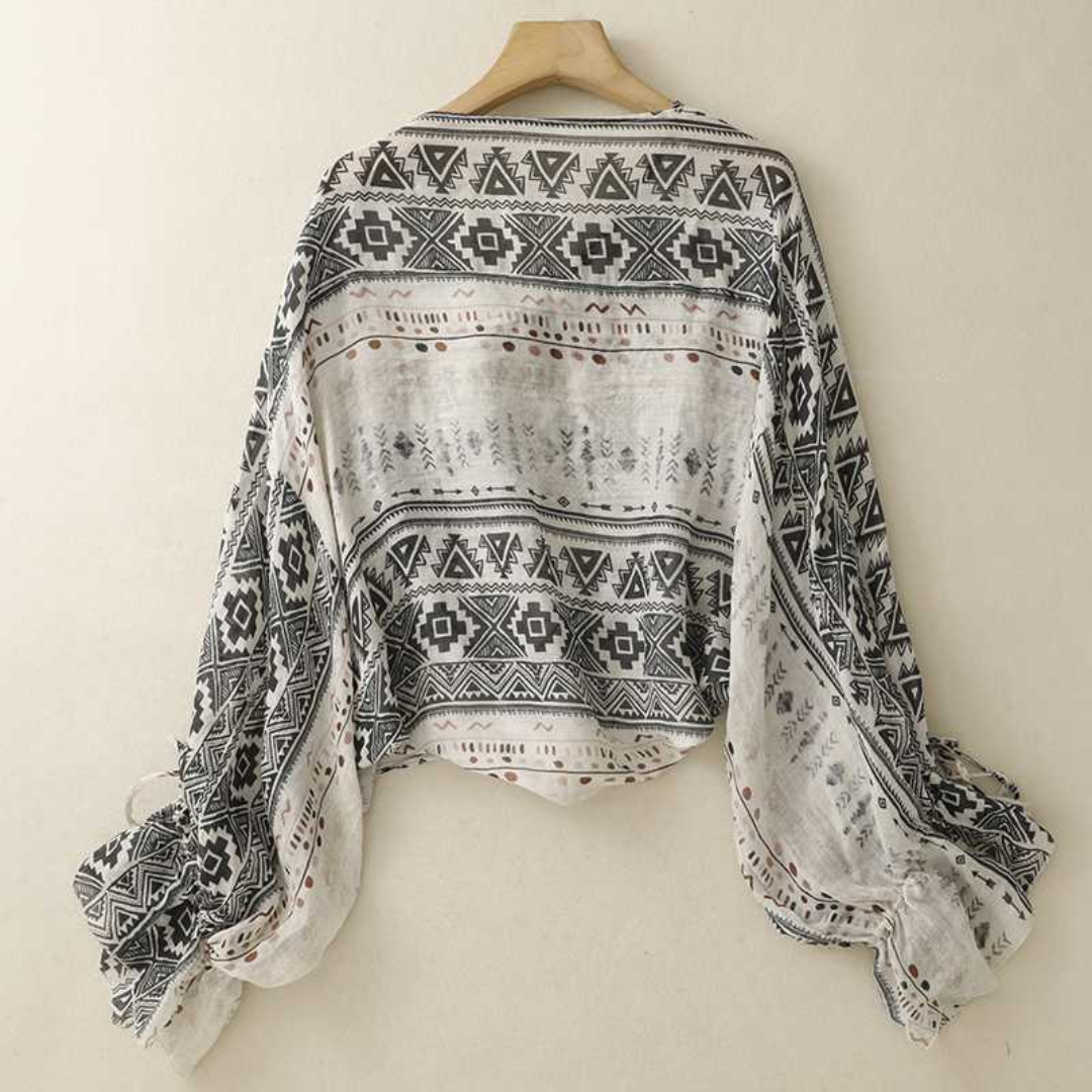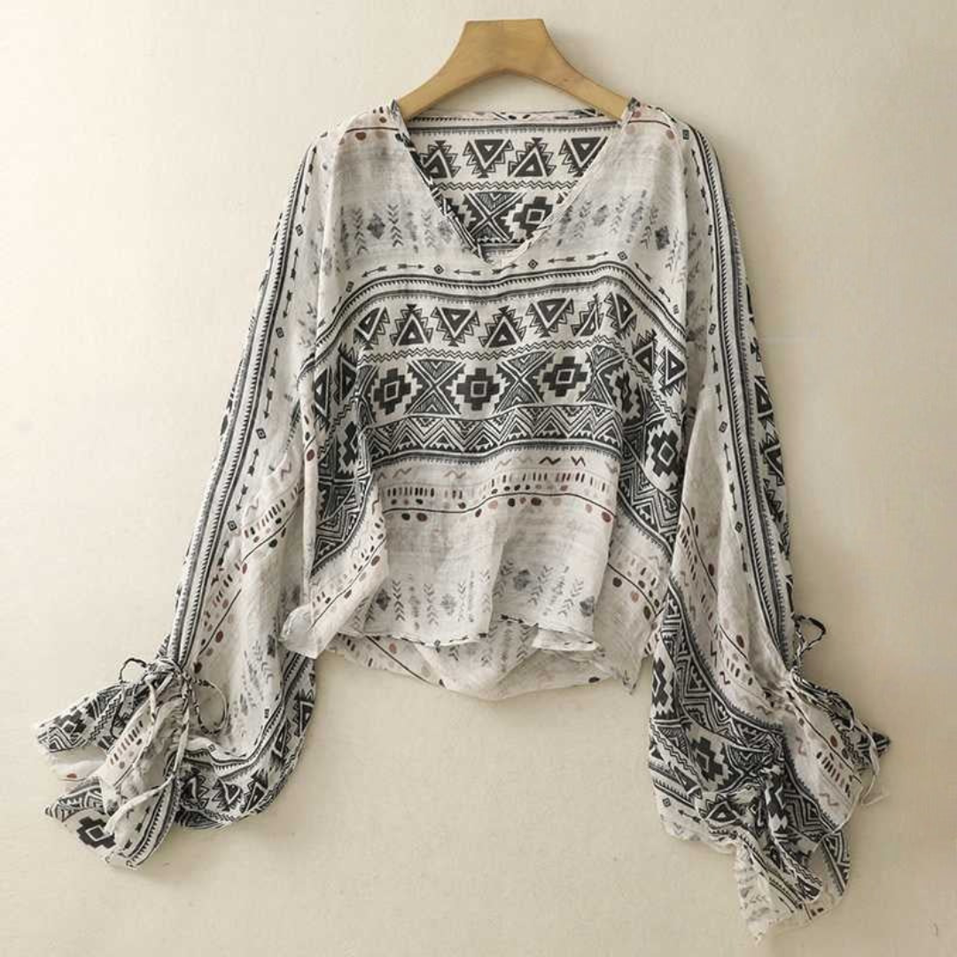 タイムレスな魅力と気負わない快適さを兼ね備えた、レトロ Vネック フローリー ブラウス。どんなシーンにもなじむ、上品で自然体の一枚です。