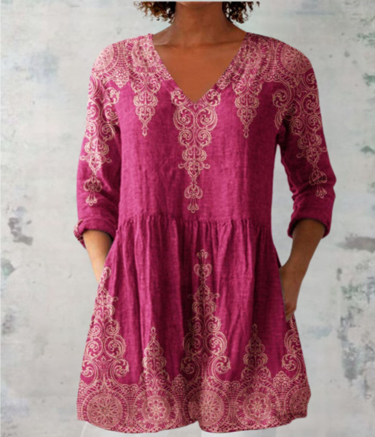通気性の良い生地は、春の穏やかな気候に最適。Vネックと七分袖が程よい抜け感を生み、日常にもお出かけにも対応できます。
