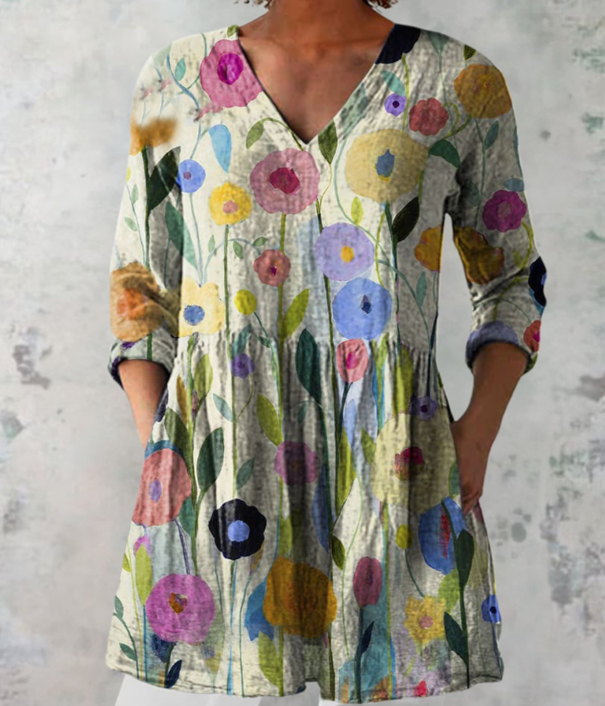 通気性の良い生地は、春の穏やかな気候に最適。Vネックと七分袖が程よい抜け感を生み、日常にもお出かけにも対応できます。