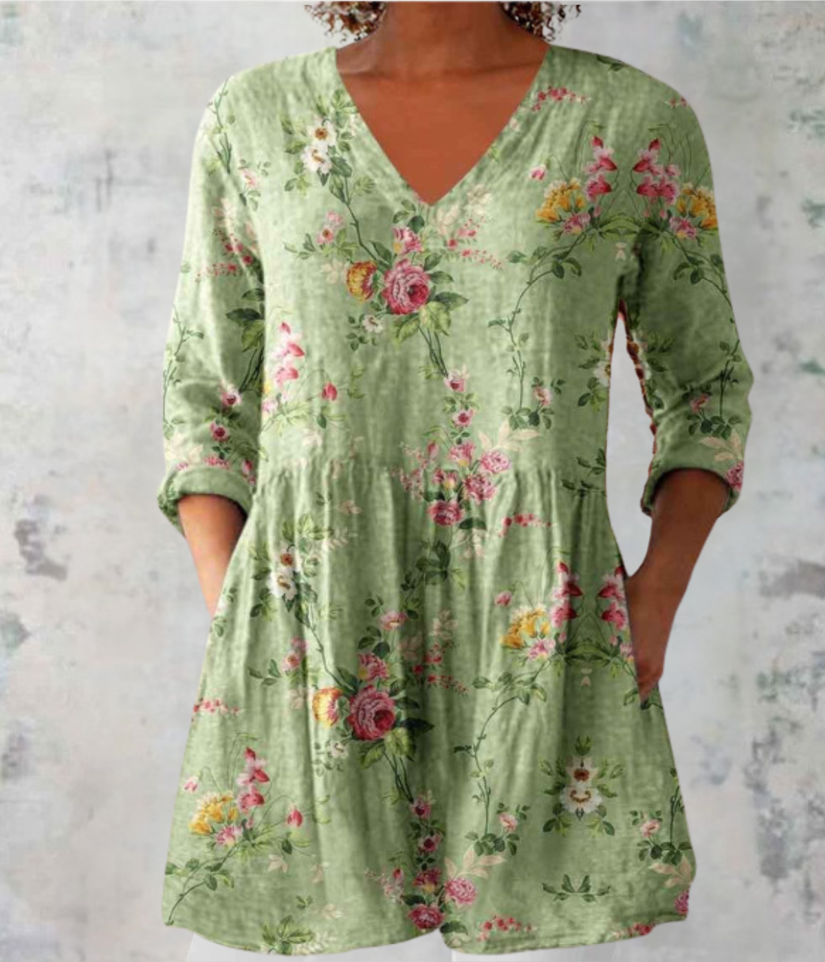 通気性の良い生地は、春の穏やかな気候に最適。Vネックと七分袖が程よい抜け感を生み、日常にもお出かけにも対応できます。