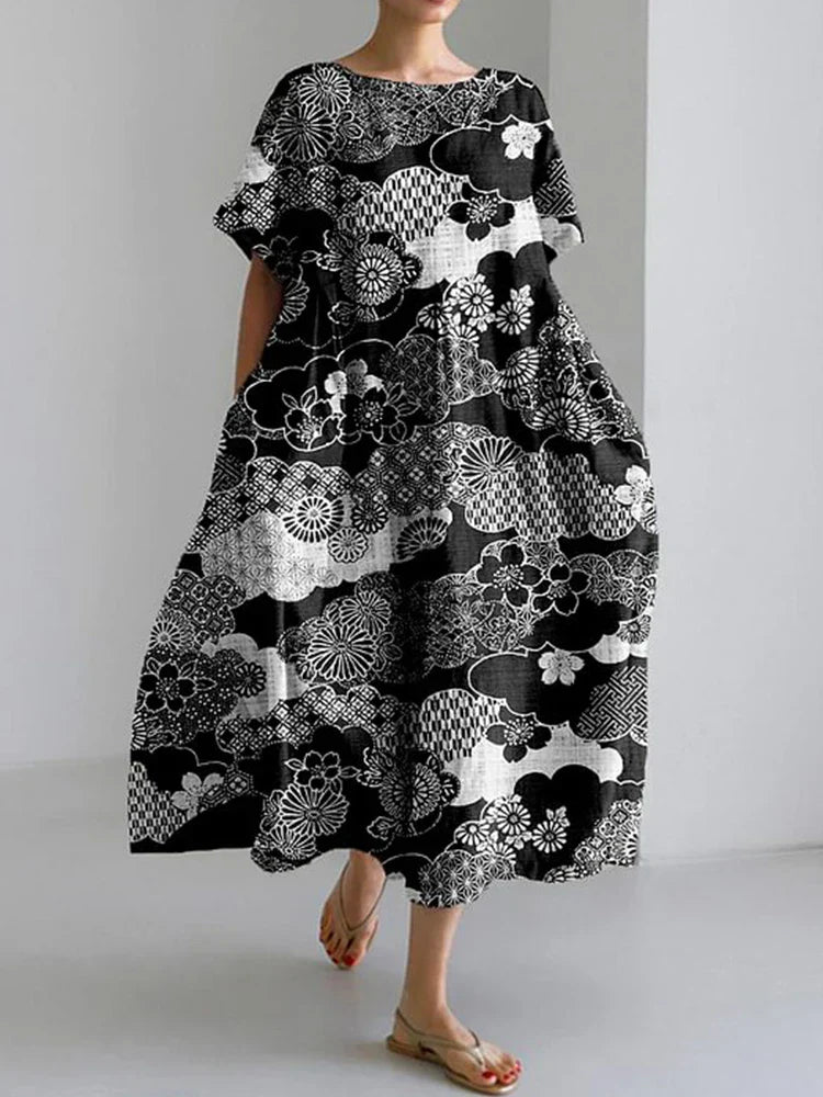 ゆったりとしたシルエットと芸術的な和柄プリントの組み合わせが絶妙で、どんなシーンでも女性らしさを引き立ててくれます。