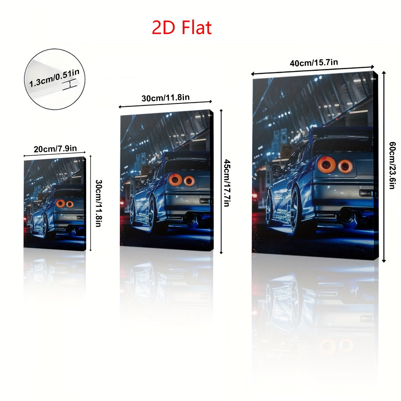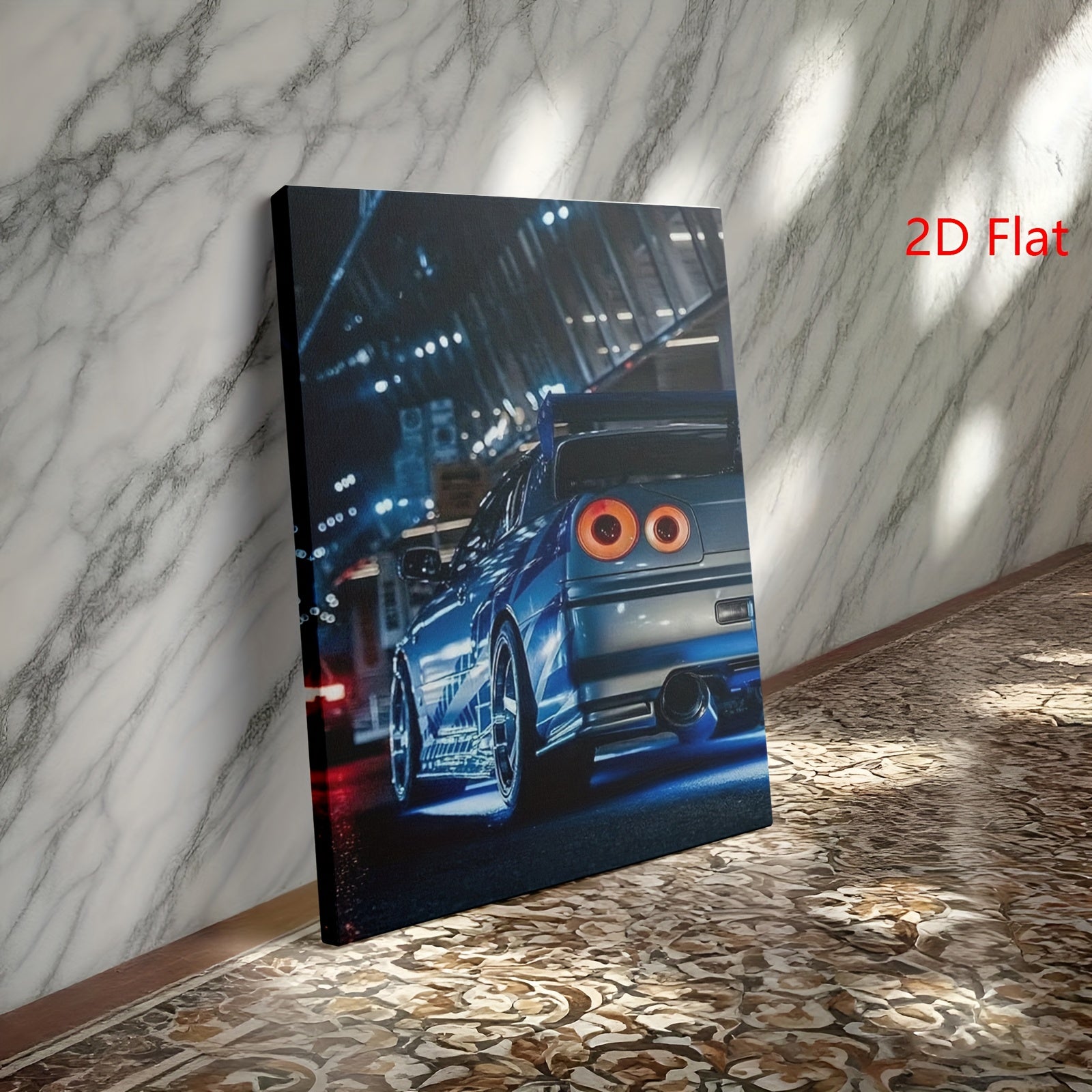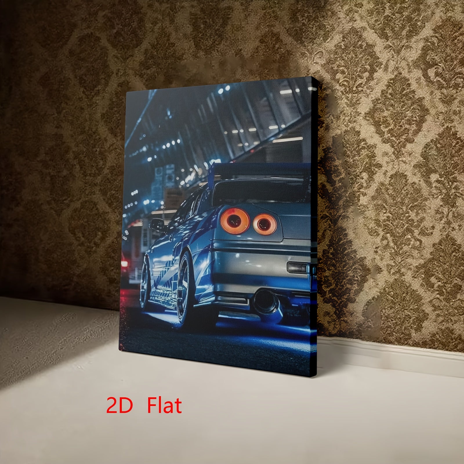 躍動感あふれる 日産スカイラインR34 を描いた、2Dキャンバスプリント。赤く光るテールランプとブルーの夜景が印象的で、JDMファン必見の一枚です。